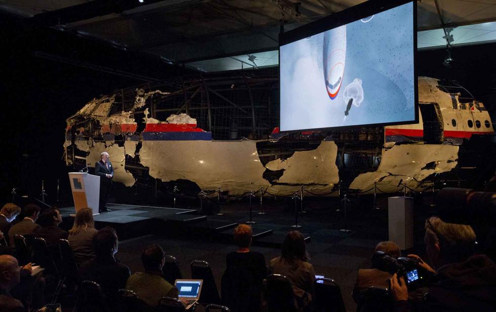 發(fā)布會現(xiàn)場,荷蘭調查人員展示了MH17航班前半截殘骸的重組。當扭曲且布滿彈孔的客機殘骸出現(xiàn)在眼前時,現(xiàn)場媒體記者一片沉寂。